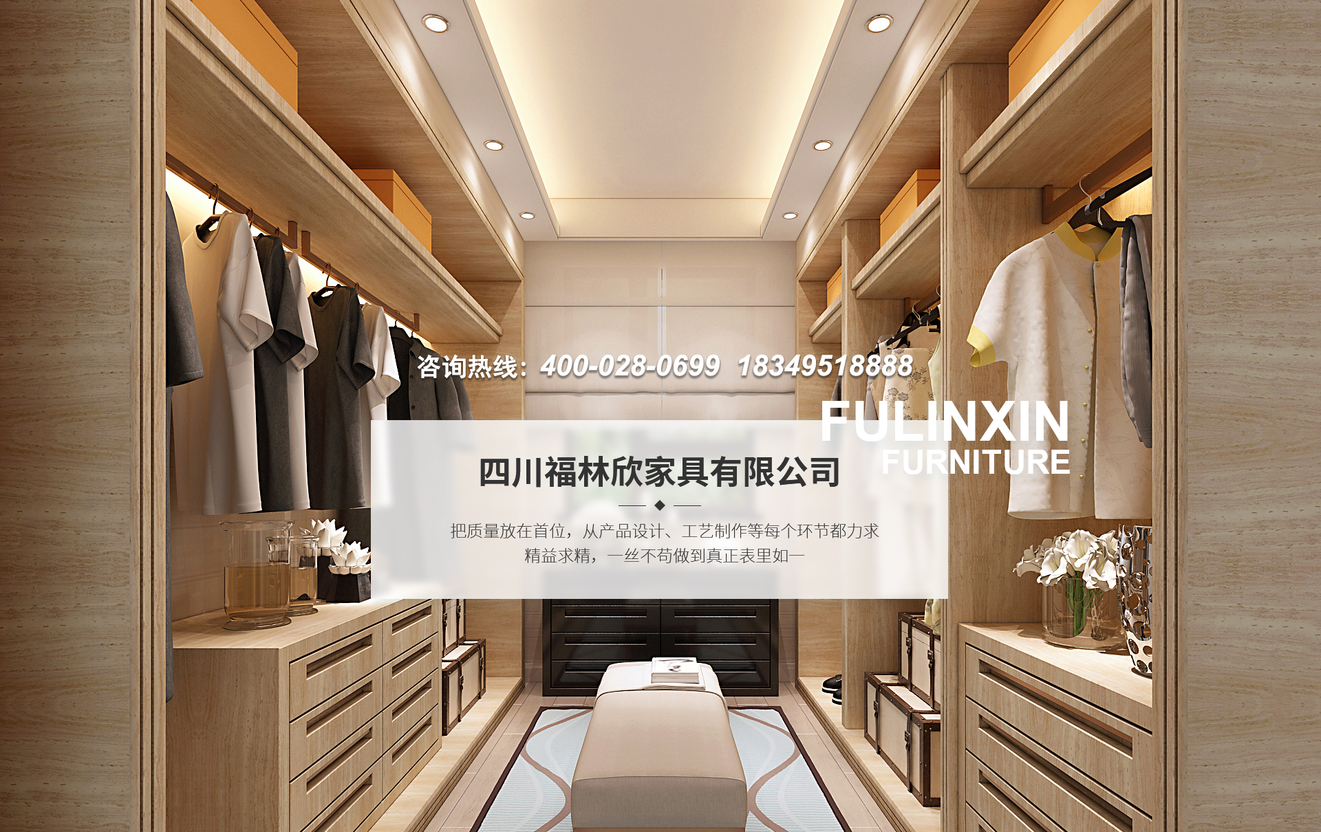 四川福林欣家具有限公司是一家專業生產整體衣柜、衣帽間、酒柜、鞋柜、電視墻、實木隔斷、免漆格柵、歐式美式墻板,免漆金屬條木飾面等多種系列的高端定制家具廠。